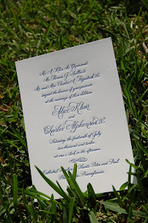 So, I have to tell you I am in love with my new studio!! Working in it, is such a dream come true. So has working with my most recent bride. She came to me and wanted letterpress invites with navy ink in all hand calligraphy script, but was concerned and wanted to make sure it was very readable. We did a very streamlines calligraphy for the majority of the lettering and then went crazy on the names and titles (on the enclosures). The result was beautiful. Crisp navy calligraphy impressed into the soft cotton paper - elegant and oh so chic!
